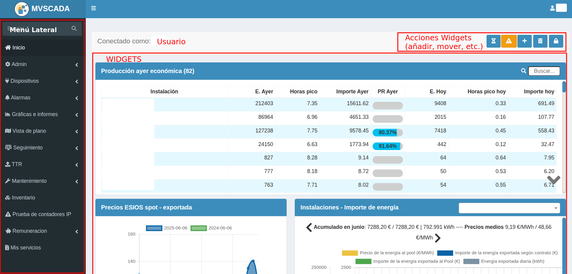 La sección Dashboard, accesible desde la página principal (home) de MVSCADA, proporciona una vista general e inmediata del estado de la planta. Está compuesta por una serie de widgets configurables, que permiten personalizar la información presentada según las necesidades del usuario.