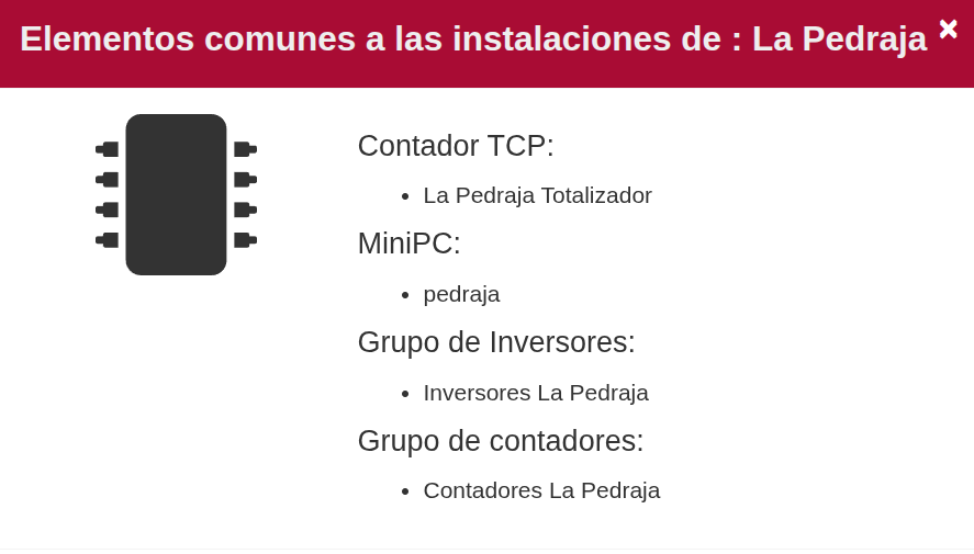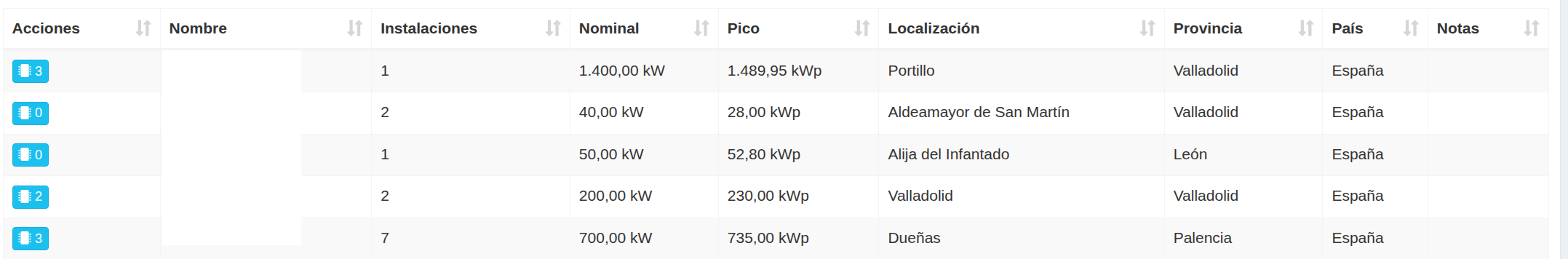 Pinchando en el icono azul bajo la columna “Acciones” se puede ver la totalidad de dispositivos (por ejemplo, Mini PCs, inversores, contadores, etc…) que están asociados a instalaciones del grupo.